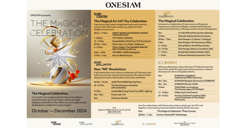 BANGKOK, THAILAND – Media OutReach Newswire – 24 October 2024 – Bangkok is set to become the ultimate destination for world-class year-end celebrations as ONESIAM, which encompasses extraordinary experiences across five of the city’s top experiential destinations, transforms Bangkok into a vibrant hub of grand celebrations. Under the banner of “The Magical Celebration,” this three-month festivity invites visitors from around the world to immerse themselves in a sensory journey filled with magical joy.