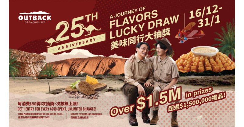 HONG KONG SAR – Media OutReach Newswire – 18 December 2024 – Outback Steakhouse 25th Anniversary Grand Finale is unveiled! From now until January 31, 2025, customers will be entitled to “A Journey of Flavors” lucky draw entry for every HK$250 net spending at Outback. For every HK$500 spent, you will be entitled to two lucky draw entries, and so on. There is no upper limit on the number of lucky draws for a single transaction. After checkout and payment, customers can participate in the lucky draw through the Outback mobile app and receive the lucky draw results instantly.