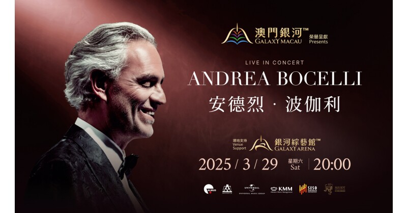 MACAU SAR – Media OutReach Newswire – 18 February 2025 – Galaxy Macau™ presents the world-renowned Italian crossover king of classic and pop music, Andrea Bocelli, who will perform his first concert in Macau at Galaxy Arena on March 29, 2025. This marks the first time the legendary tenor has appeared at Macau’s largest indoor arena. This concert will feature a unique setlist, offering fans in Macau, Hong Kong, and throughout Asia-Pacific a rare opportunity to experience this exceptional artist live.