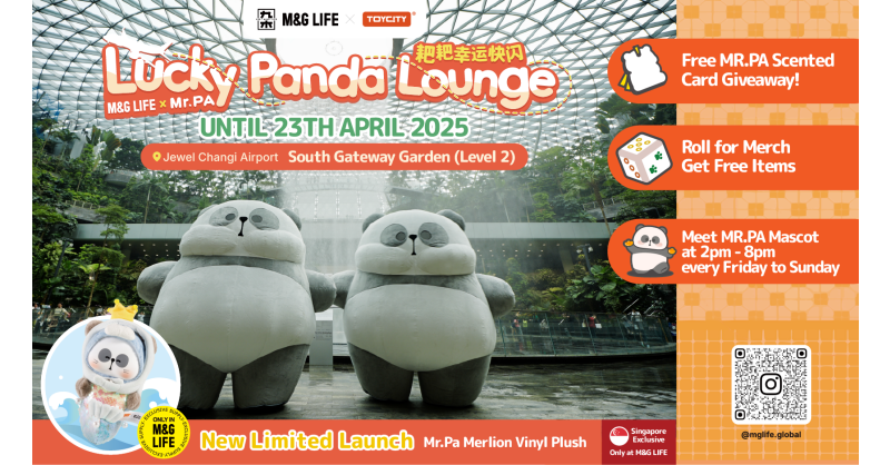 SINGAPORE – Media OutReach Newswire – 18 April 2025 – Creative lifestyle brand M&G LIFE has joined hands with original art toy icon MR.PA from TOYCITY to host a themed pop-up, “Lucky Panda Lounge,” at South Gateway Garden, Level 2 of Jewel Changi Airport. Running from March 27 to April 23, 2025, the pop-up brings a refreshing cultural and creative experience to local fans and international visitors alike.
