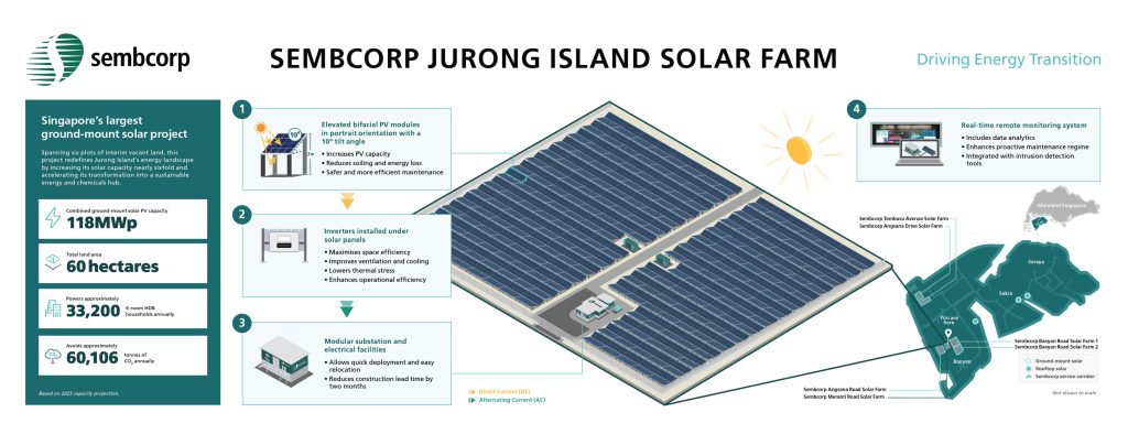 The Sembcorp Jurong Island Solar Farm, with an installed capacity of 118MWp, is Singapore’s largest ground-mounted solar project to date. Spanning six interim vacant land parcels in an industrial zone, the solar farm generates clean energy sufficient to power approximately 33,200 four-room HDB flats annually.