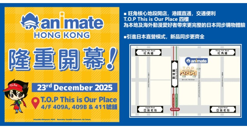 HONG KONG SAR – Media OutReach Newswire – 23 December 2025 – Japan’s largest anime merchandise specialty store, Animate, officially opened today (December 23) in Mong Kok, returning to Hong Kong in a direct operation format. The new store is located on the fourth floor of the popular shopping mall, T.O.P This is Our Place, providing local and overseas anime fans with a more complete synchronized shopping experience from Japan.