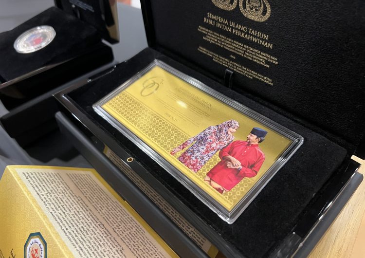 The design is adorned with the motif of the traditional woven fabric “Kain Si Lubang Bangsi,” recognised for its cultural significance, and incorporates the number “60” expressed in both Roman and Jawi numerals. The reverse of the gold foil displays the personal crests of His Majesty and Her Majesty, symbolising the sovereignty and steadfastness of the beloved royal institution.
