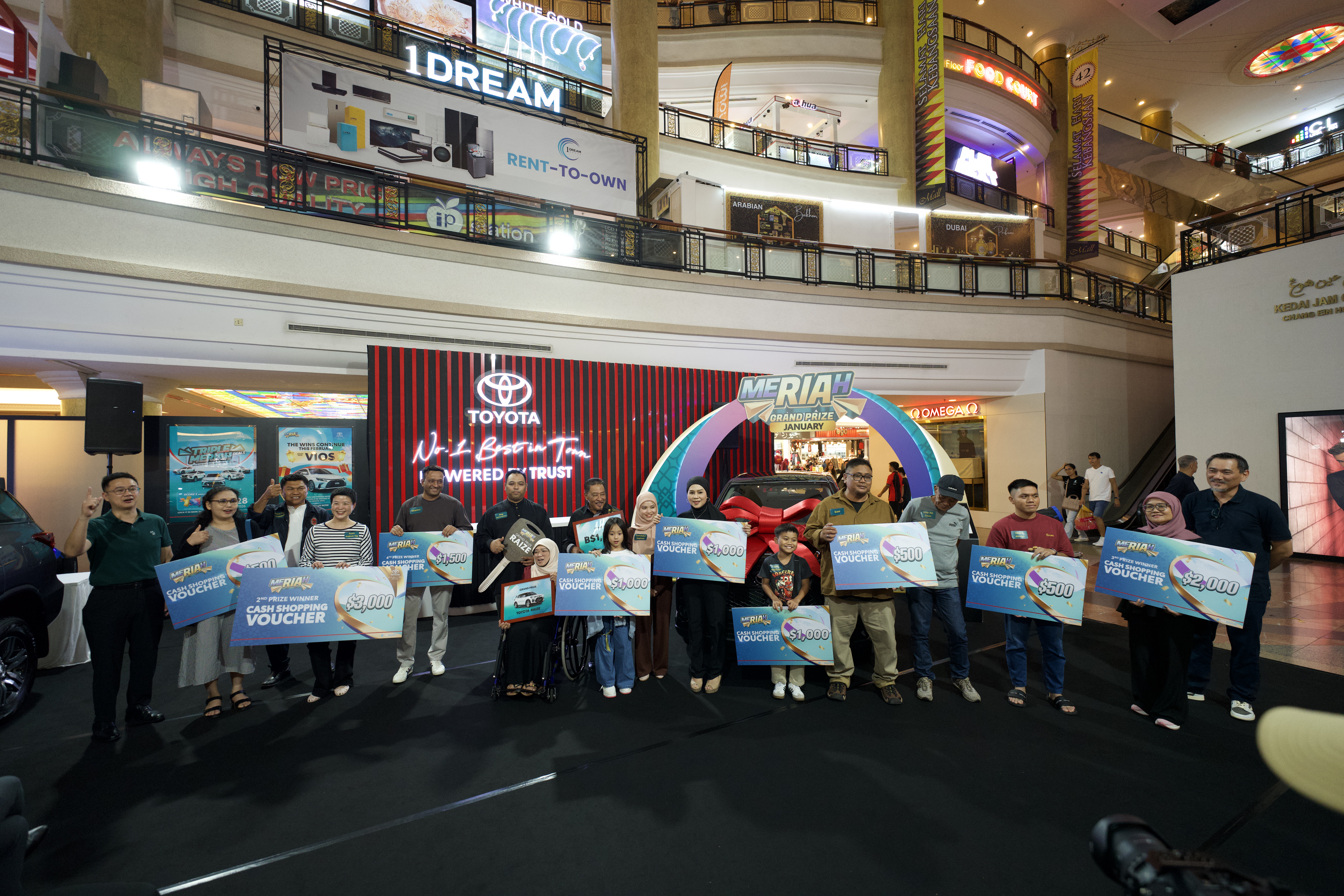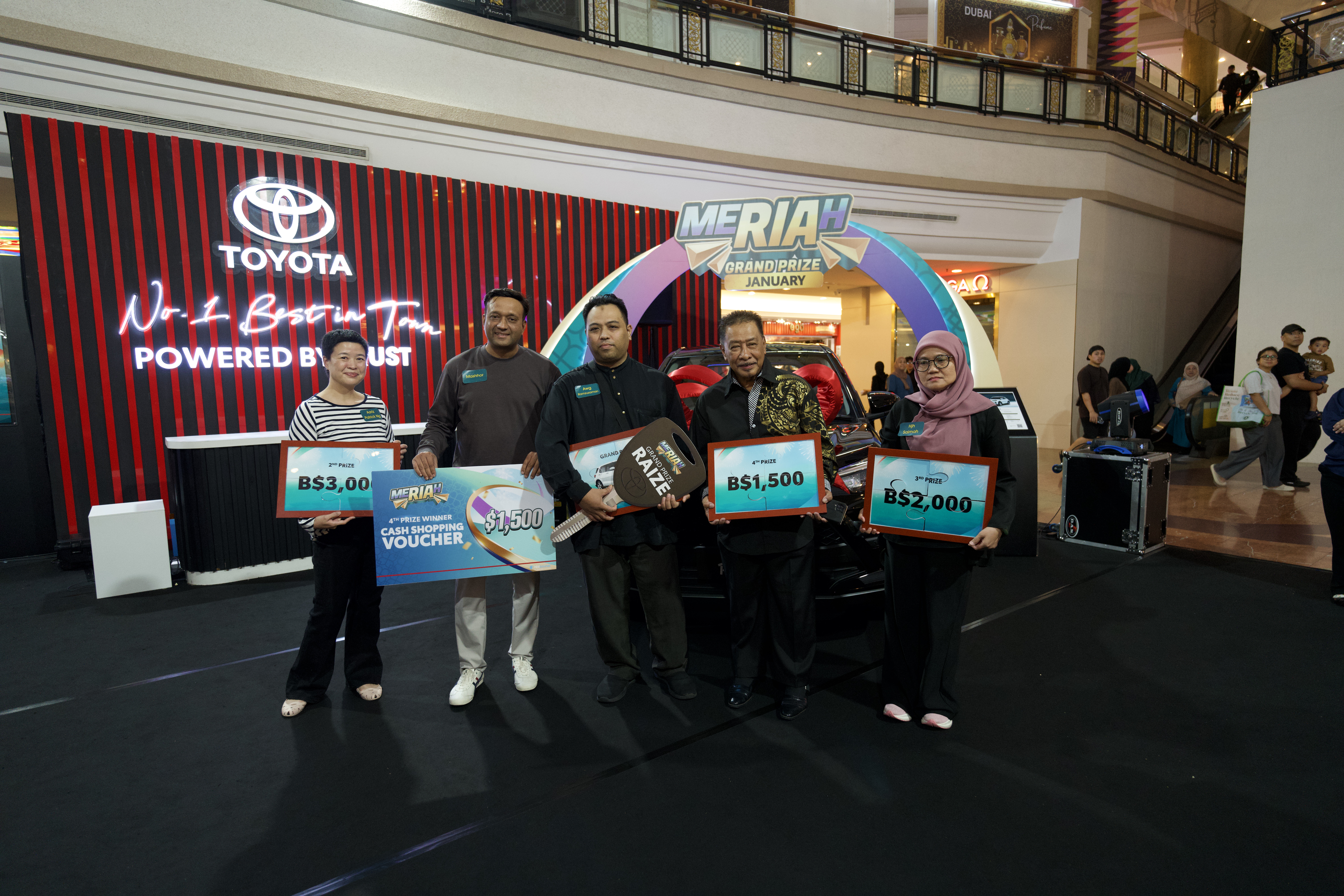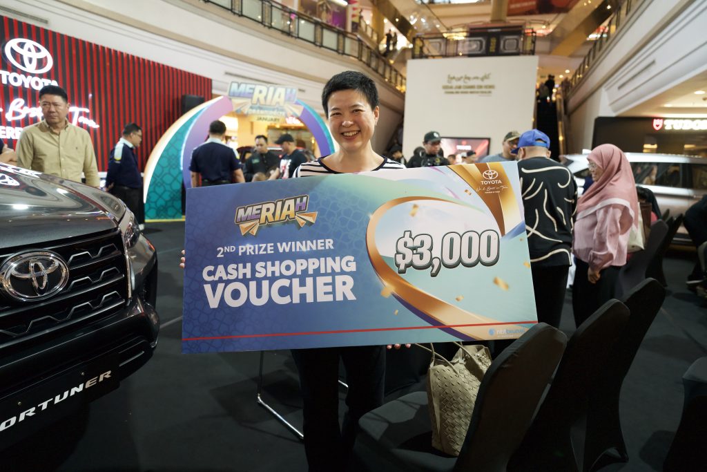 Besides the grand prize of a Toyota Raize, participants stood a chance to win shopping vouchers valued from B$500 to B$3,000. Second place, a shopping voucher worth B$3,000, was won by Aariz Patrick Ng @ Ng Kee Khen. Third place went to Hjh Saimah Binti Mohd Said, who received a B$2,000 shopping voucher, while Mashhor General Contractor Sdn Bhd secured fourth place with a B$1,500 shopping voucher.