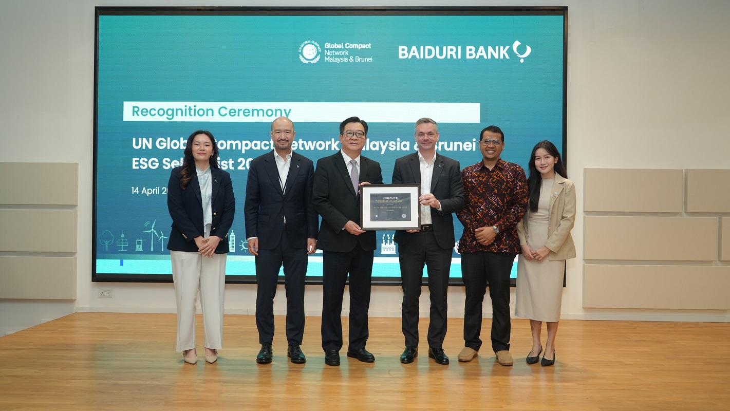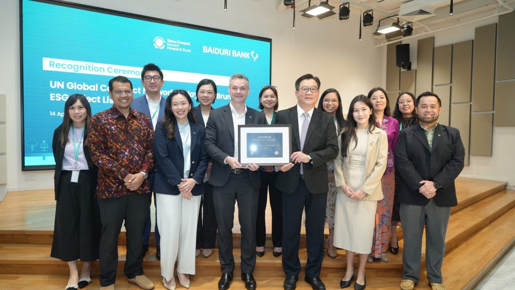The recognition was presented by UNGCMYB representatives, including Executive Director Faroze Nadar and Deputy Executive Director Angeline Seah, to Ti Eng Hui, Chief Executive Officer of Baiduri Bank. The presentation was witnessed by senior members of the bank’s management and sustainability committees.